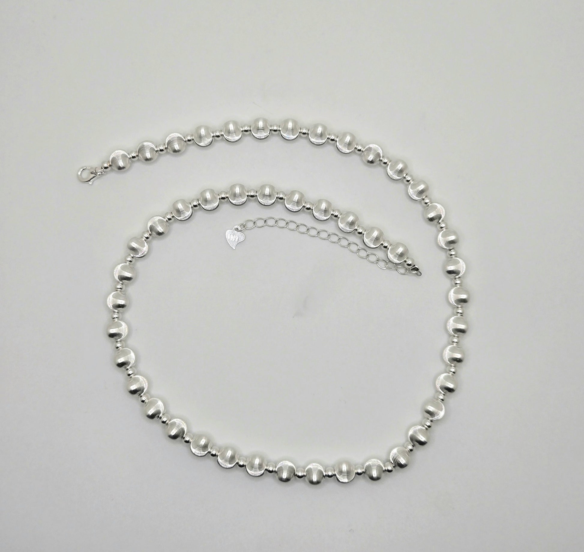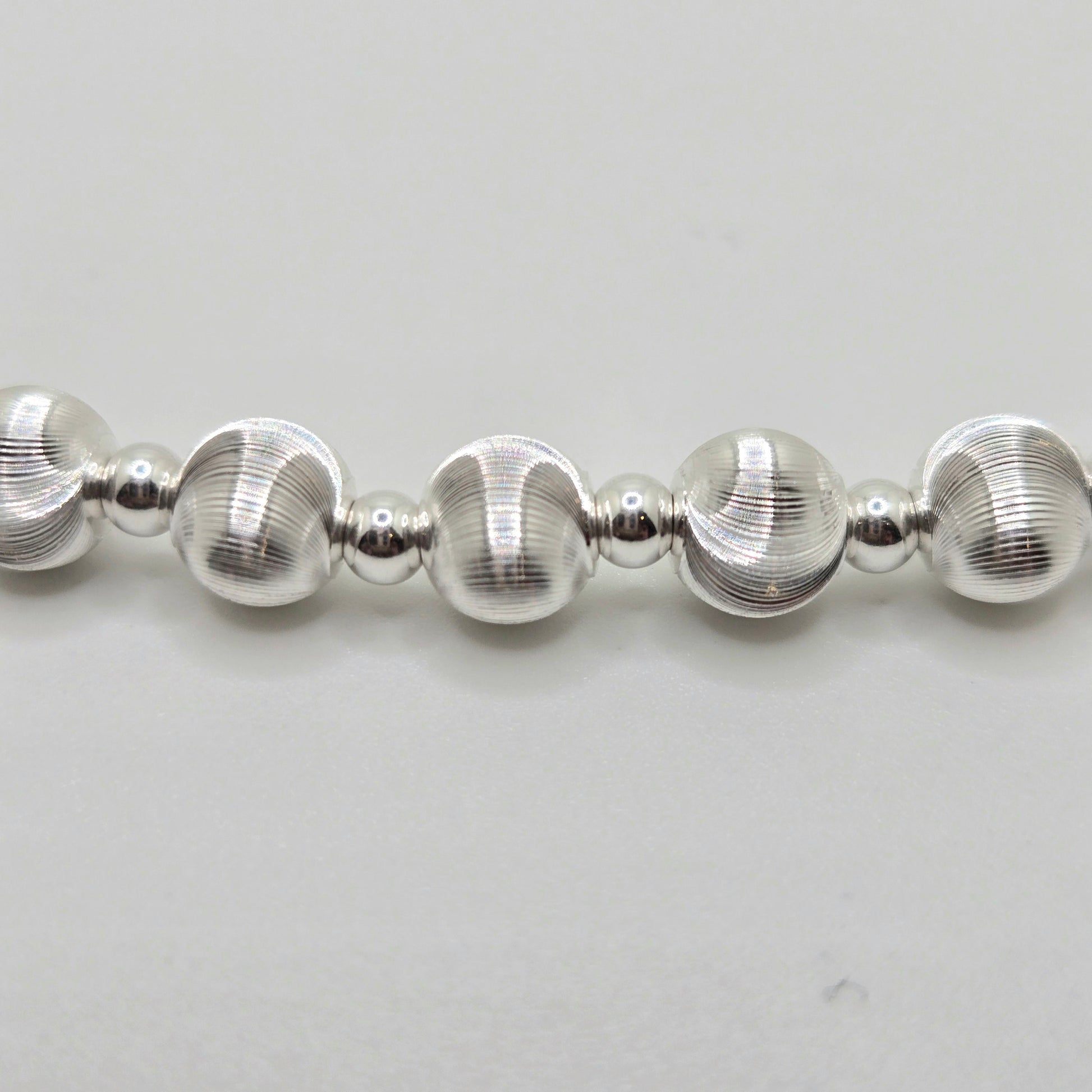 92.5% sterling silver corded necklace with 92.5% sterling silver plated Cat's Eye beads.