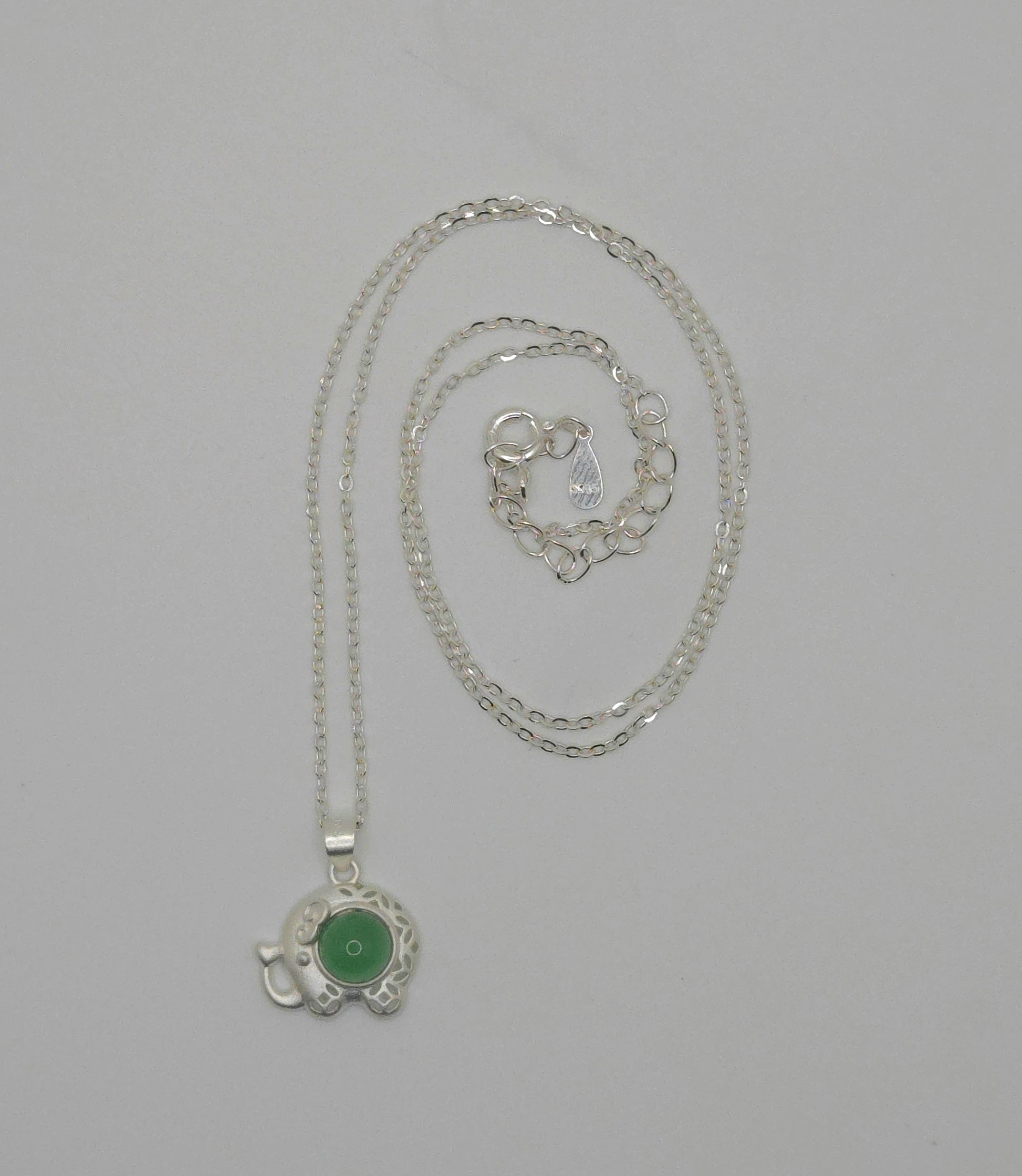 92.5% sterling silver clavicle necklace with 92.5% sterling silver elephant pendant with green glass bead.