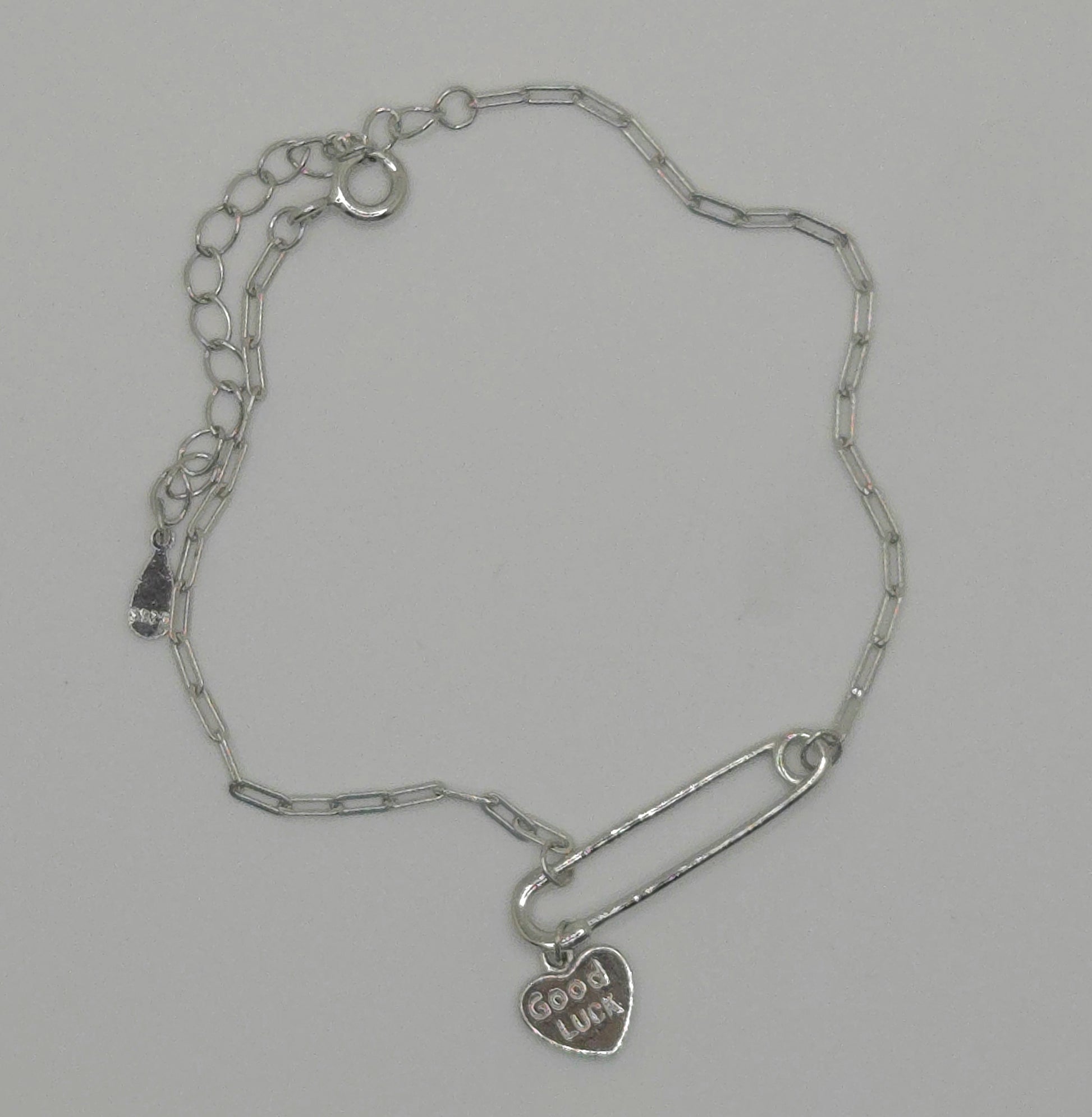92.5 % sterling silver bracelet with love pin and 'Good Luck" heart charm.
