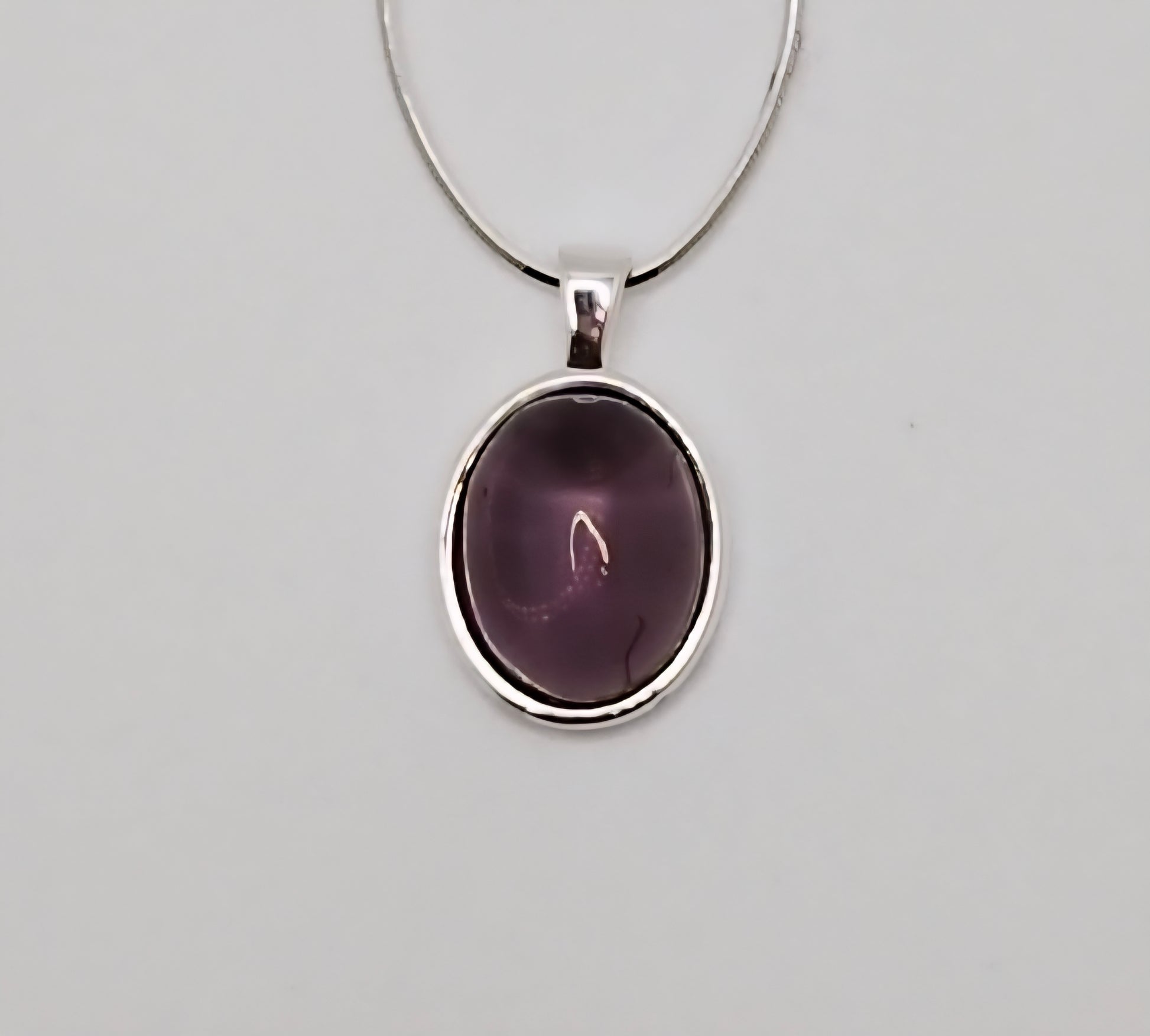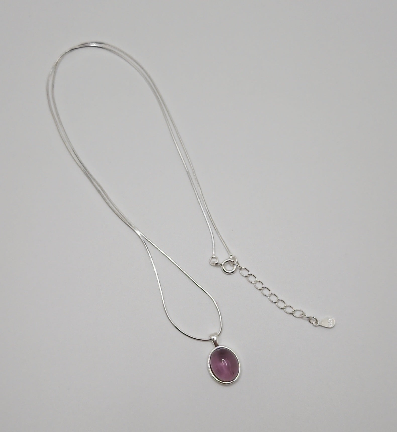 92.5% sterling silver snakebone necklace with deep purple oval shaped amethyst pendant.