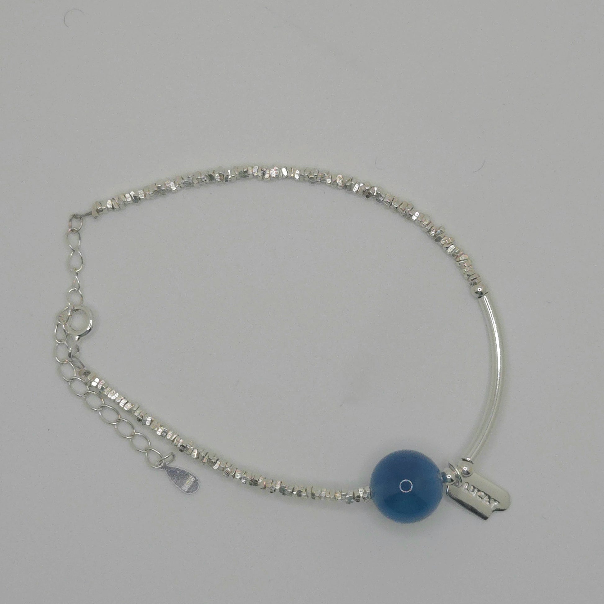 92.5% crushed sterling silver bracelet with blue agate stone marble and 92.5% sterling silver "lucky" tag accent.
