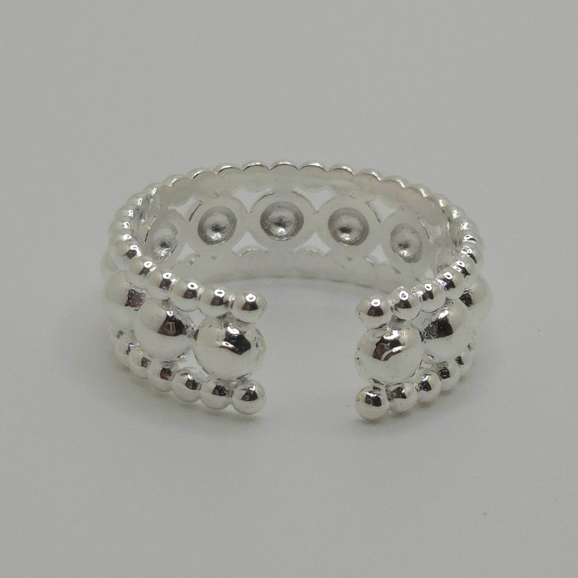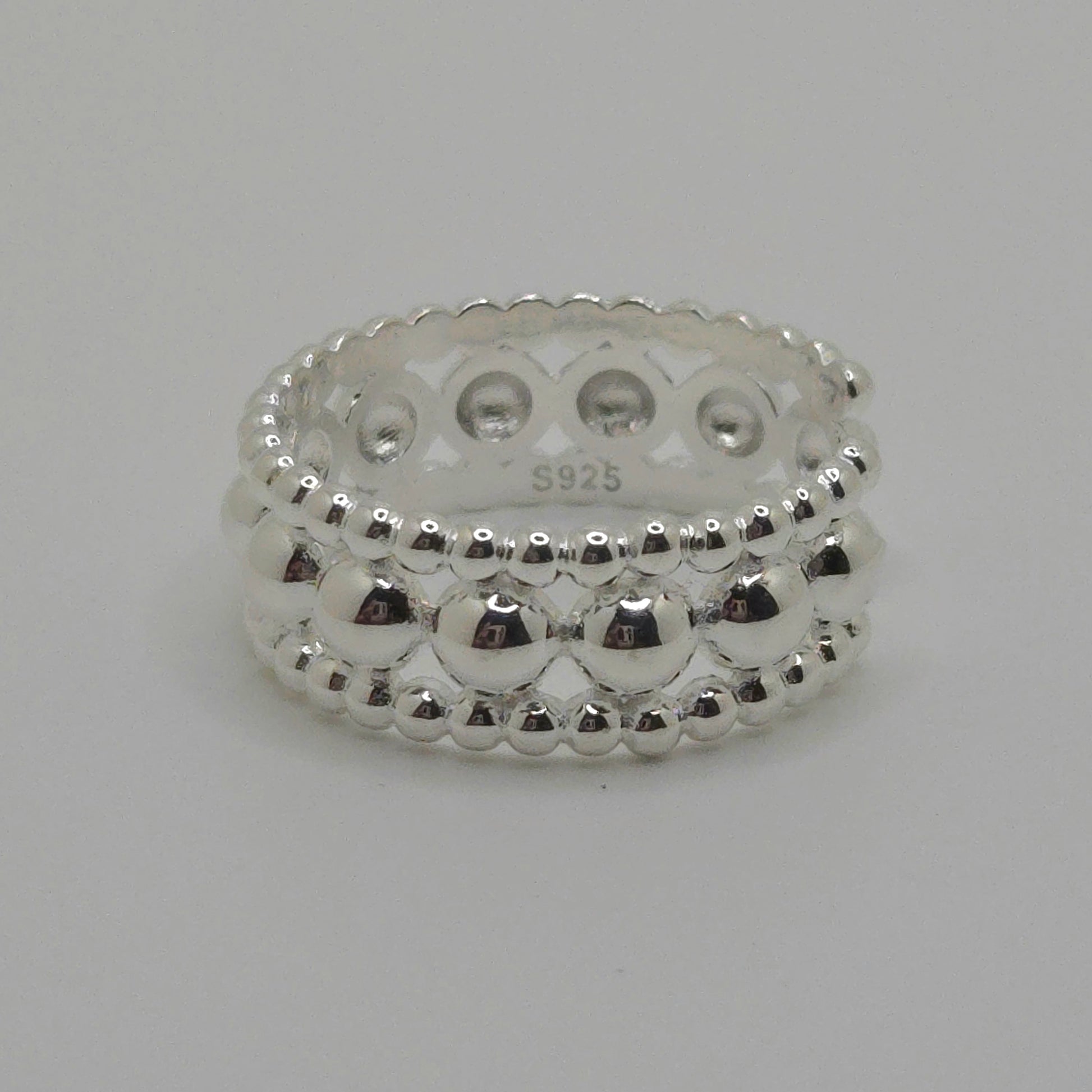 Adjustable 92.5% sterling silver three layer open stacked hollow bead ring.